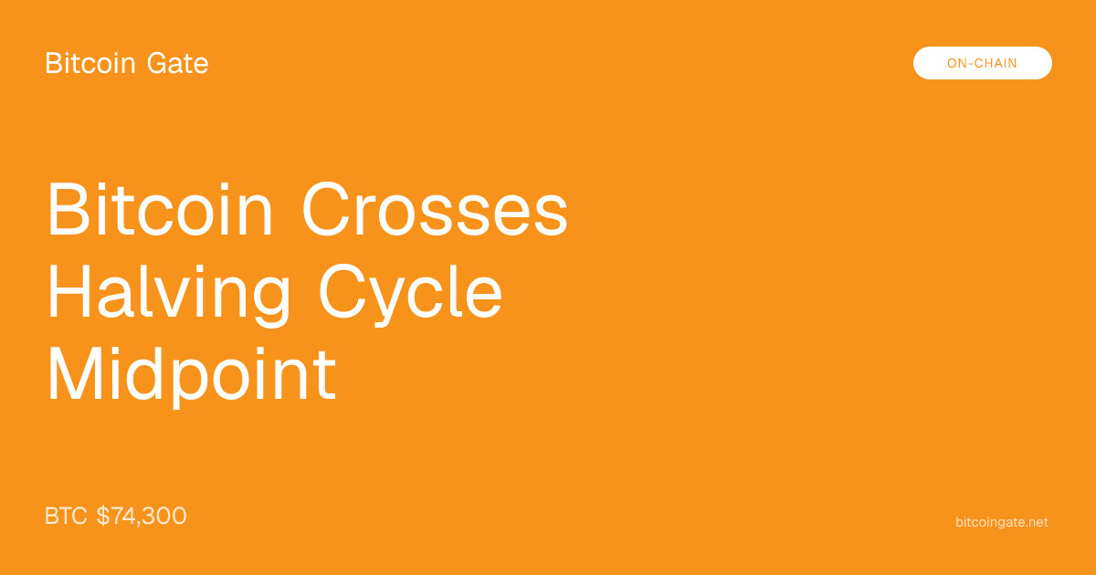 But the more interesting number is what the price has done since the April 2024 halving. Bitcoin is up roughly 15% from $64,000 to $74,300 at the halfway mark. In every prior cycle, returns over the equivalent window ran several multiples higher.