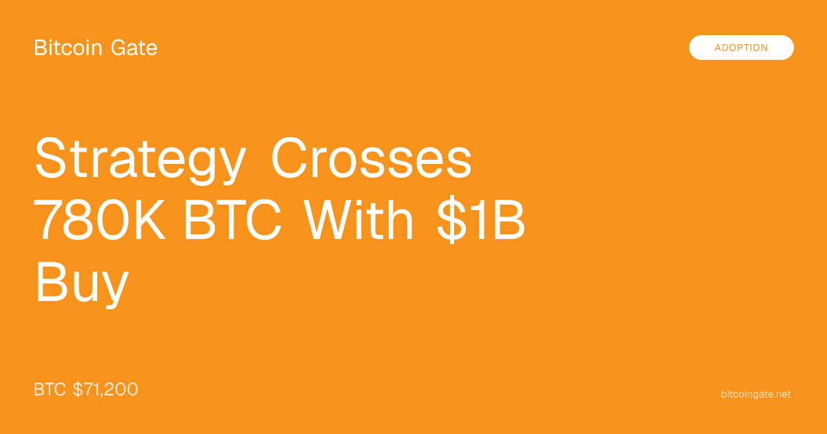 Strategy filed an 8-K on Monday disclosing the purchase of 13,927 bitcoin for approximately $1 billion, acquired at an average price of $71,902 per coin. The purchase, made between April 6 and April 12, brings the company's total holdings to 780,897 BTC.